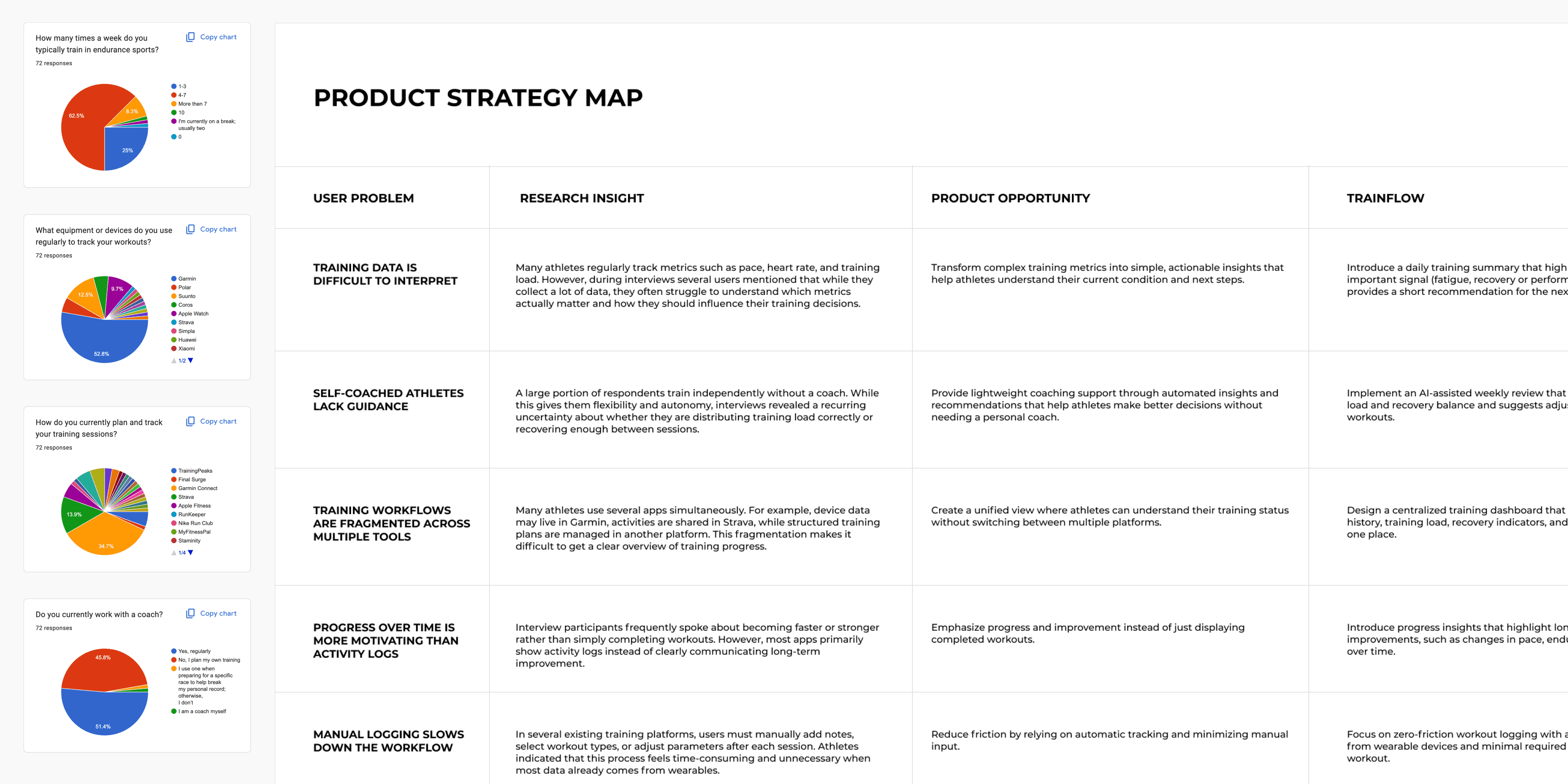 Many users also described friction in communication with coaches and difficulties keeping training plans, workouts, and feedback synchronized. These findings helped define the initial product direction and prioritize a focused MVP scope.