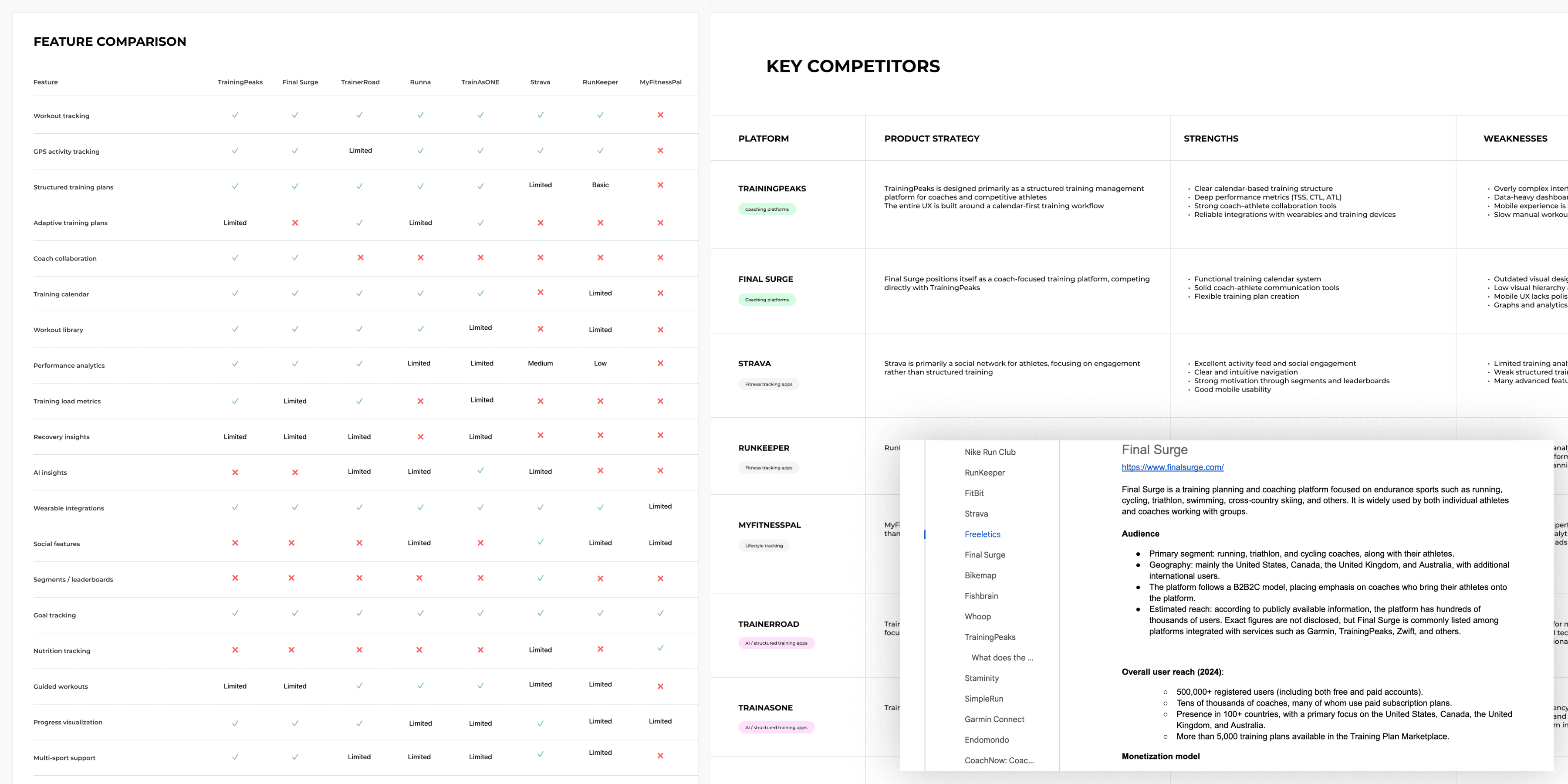 To better understand the problem space, I began with user interviews with endurance athletes and conducted a competitive analysis of existing training platforms. The research revealed that although athletes collect a large amount of training data, they often lack clear insights that help them understand progress over time.